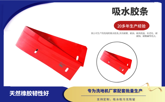 產(chǎn)品說明:吸水膠條是洗地機(jī)吸水扒上的重要部件,作用就是與地面接觸,產(chǎn)生一個(gè)密封的空間,把地面上的污水通過風(fēng)機(jī)進(jìn)行回收。吸水膠條一般分為耐油型(進(jìn)口PU原料)和普通型(進(jìn)口NR原料)兩種。